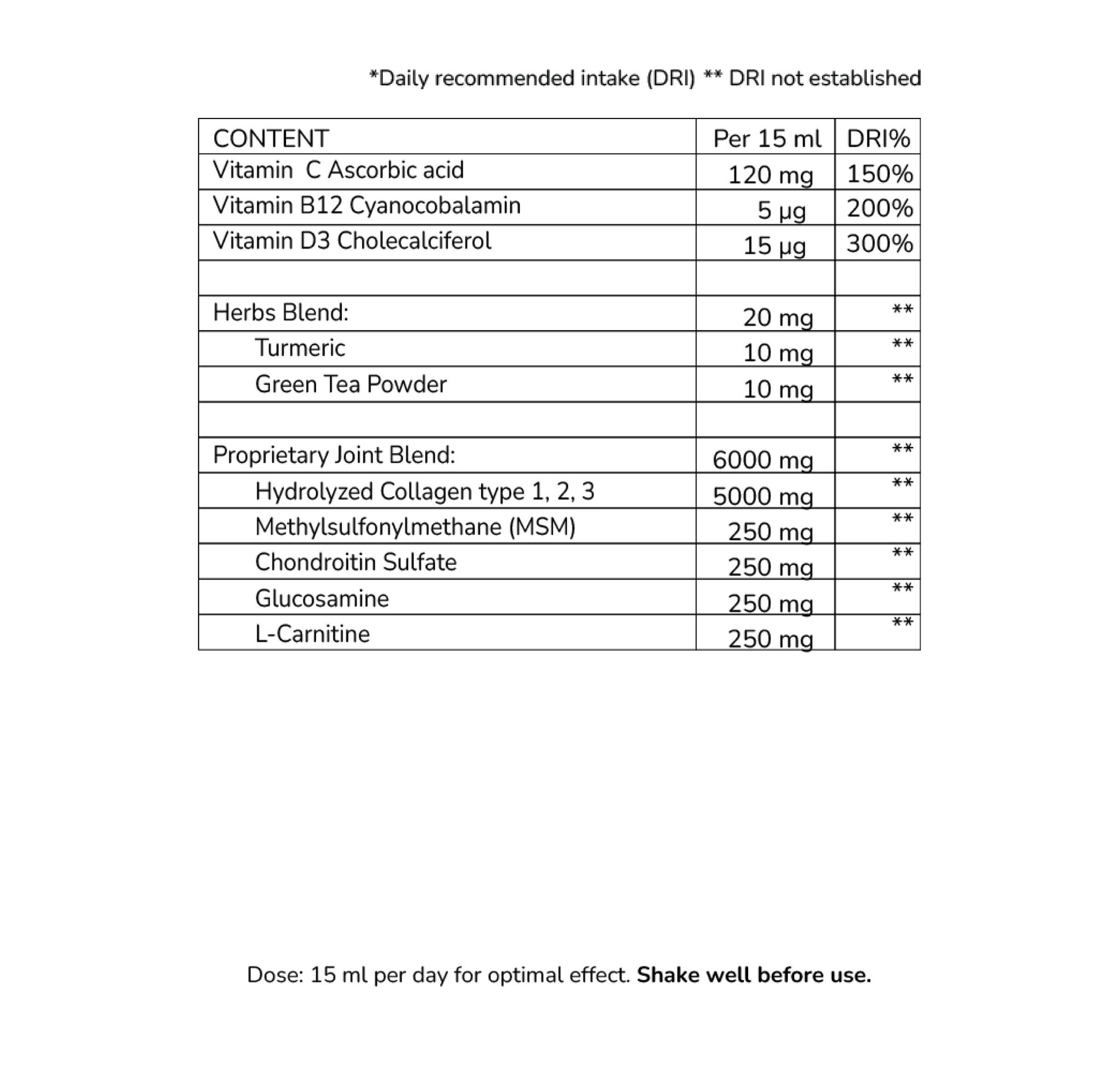Collagen Joint Support Sugar Free is designed to Ease Joint Pain and contribute to cartilage repair. One daily shot of 15 ml contains top-rated hydrolyzed collagen type II to help the maintenance of healthy joint structures. Enriched with Vitamins, Herbs and our Proprietary Joint Blend.